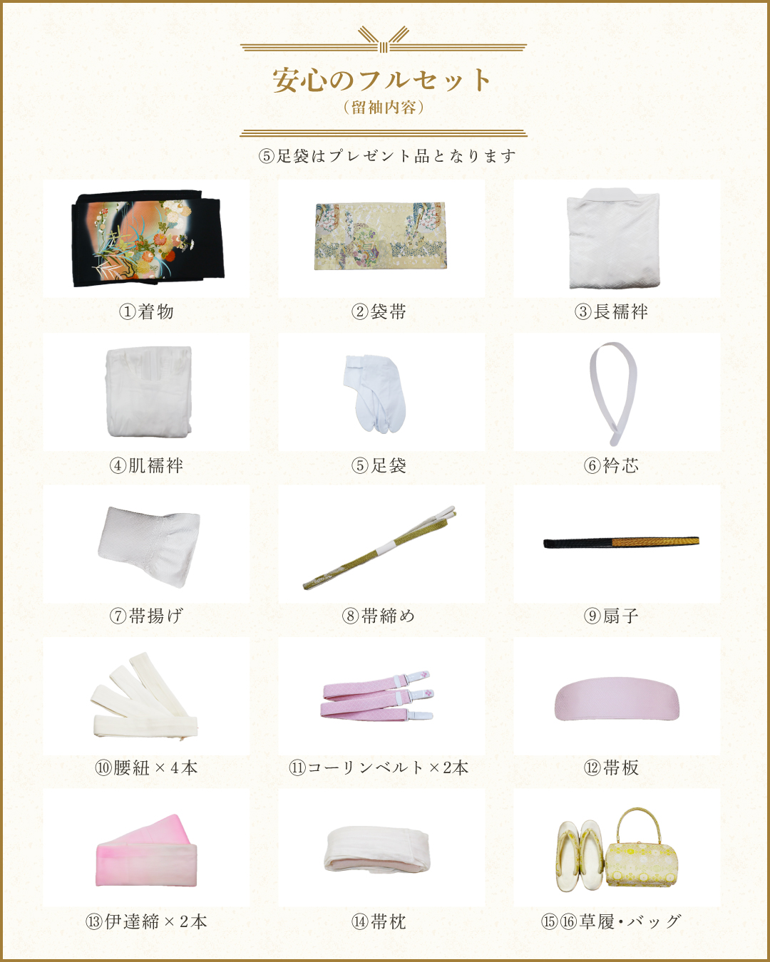 【安心のフルセット】着物・袋帯・長襦袢・肌襦袢・足袋・衿芯・帯揚げ・帯締め・扇子・腰紐×4・コーリンベルト×2・帯板・帯枕・伊達締め×2・草履・バック