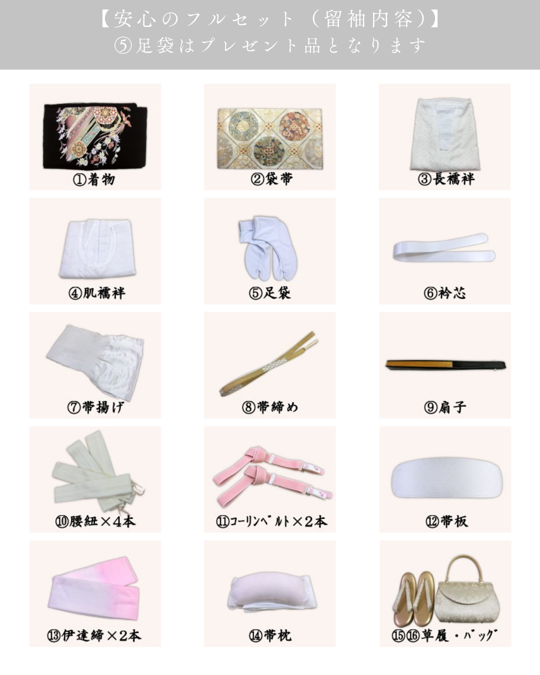 【安心のフルセット】着物・袋帯・長襦袢・肌襦袢・足袋・衿芯・帯揚げ・帯締め・扇子・腰紐×4・コーリンベルト×2・帯板・帯枕・伊達締め×2・草履・バック
